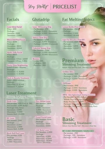 At Hey Pretty Aesthetic Center Premium Subic Bay, we offer a full range of beauty and wellness treatments — from facials, slimming, and IV drips to laser care and microneedling. Our transparent price list ensures you know your options, whether you’re looking for a quick glow-up or a complete transformation. Every package is designed to deliver visible results at the best value, trusted by 200+ clients in Subic Bay/Olongapo